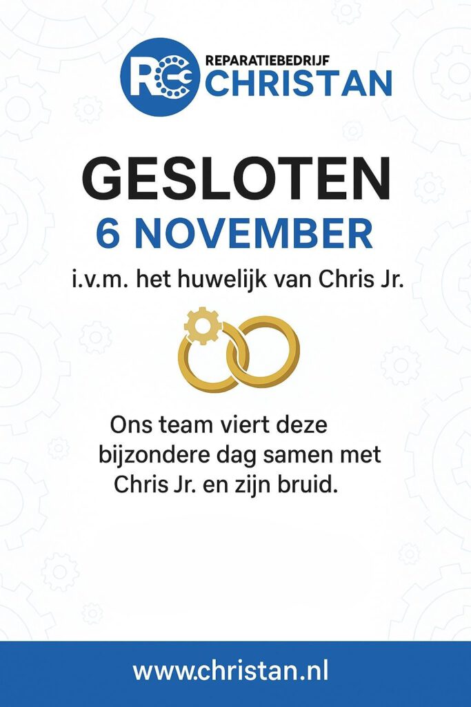 Bij Reparatiebedrijf Christan geloven we in eerlijk vakmanschap en persoonlijke service. Al sinds 1996 zetten we ons in om elk technisch probleem snel en goed op te lossen. We zijn pas tevreden als uw onderdeel weer draait en u met een glimlach vertrekt.